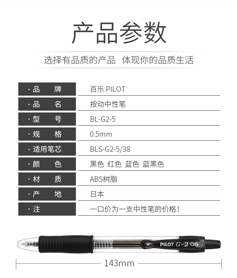 商品名稱:百樂(PILOT) 0.5mm中性筆 按制啫喱筆 大容量水筆 BL-G2-5 黑色 0.5mm